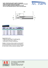 • Punta a tagli elicoidali positivi e negativi per pantografo • Mèche à coupes Hélicoïdales positives et negatives pour pantographe Art. 358PN • Positive and negative spiral bit for pantograph • Bohrer mit positiver und negativer Drallnut für Pantograph • Broca de cortes helicoidales positivos negativos para pantógrafo LT L I2 D S HM INTEGRALE Z2+2 D L LT S CODICE mm mm mm mm Rotazione Dx 8 32 80 8 358PN08DHM 10 32 80 10 358PN10DHM 12 42 90 12 358PN12DHM 16 55 110 16 358PN16DHM 18 55 110 18 358PN18DHM Caratteristiche tecniche • Metallo duro super micrograno di qualità superiore • 2 taglienti elicoidali positivi e 2 negativi HM (Z2+2) • Finitura ottimale della superficie lavorata • Ottima finitura su entrambi i lati del pannello Impiego: per contornare, sezionare e sagomare a misura sul legno massiccio e i suoi derivati, anche laminati e materiale plastico, con sorprendente efficaccia ed alta velocità di avanzamento, pezzi ben serrati al piano di lavoro. Da inserire su mandrini o adattatori per centri di lavoro, macchine punto/punto, pantografi a CNC. Si costruiscono con Hartmetall integrale Se construisent avec Hartmetall intégral Made in Hartmetall Herstellung komplett aus Hartmetall ADRIATICA UTENSILI Se fabrican con Hartmetall integral UTENSILI PER LA LAVORAZIONE DEL LEGNO 130